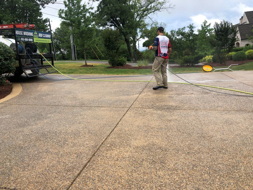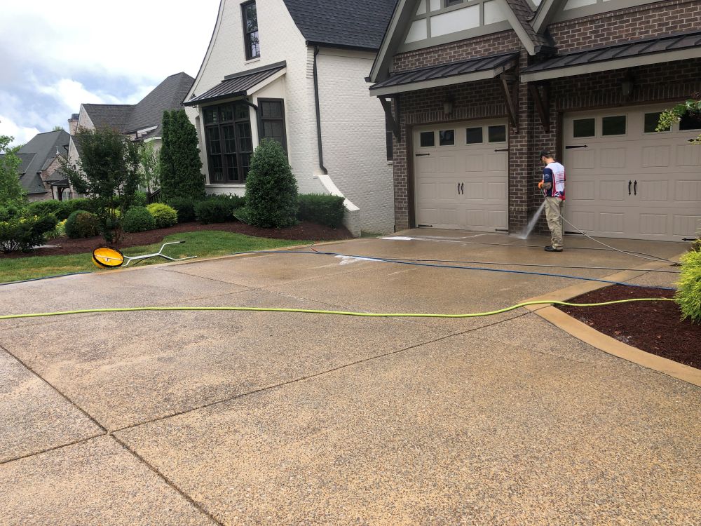 We completed a professional driveway cleaning on Van Leer Drive in Nashville, Tennessee. This concrete driveway had organic growth, mildew, algae, and traffic staining common on shaded Nashville properties. We pre-treated the surface with a concrete-safe cleaner to break down buildup embedded in the pores.